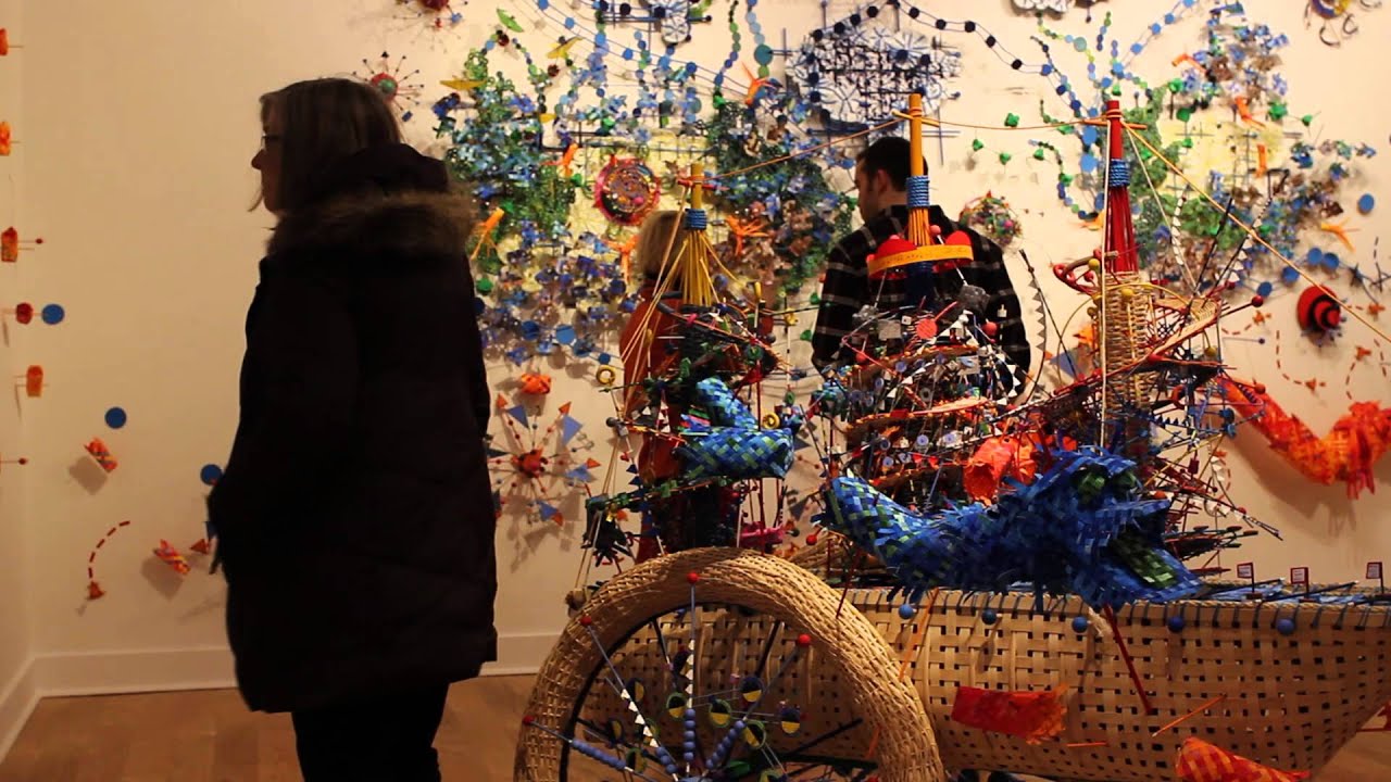 Nathalie Miebach’s turbulent artworks are rooted in real-world scientific research and a fascination with our nuanced relationship to weather. Whether on the North Pole or in Central Massachusetts, people always have a story about a storm. Miebach untangles our connection to weather by translating climatic data derived from high and low-tech instruments, as well as personal observations, into three-dimmesnional sculptures. Her forms transform numerical statistics normally relegated to two-dimensional charts, maps, and graphs into exhilarating abstract objects that burst with clues about weather patterns, hurricanes, storms, blizzards, changing tides and temperatures, and whipping winds. Woven like baskets from reed and rope, and punctuated with multicolored paper, Miebach’s sculptures are dizzying, beautiful, clever, and complex. They are artworks and tools, creative expressions and authentic records that combine the methodologies of astronomy, ecology, and meterology with those of art.