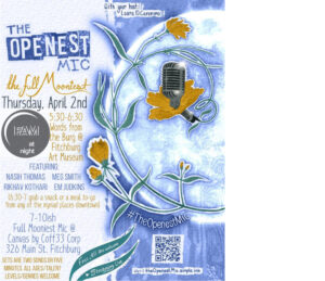 Openest Mic has partnered with FAM at Night to present Words from the Burg, a popular poetry reading event hosted by local arts organizer, Laura DiCaronimo. Featured “local-ish” poets will include: Nasih Thomas, Meg Smith, Rikhav Kothari, and Em Judkins. This community programming is free and open to all. The festivities will continue with the “Full Mooniest Mic” at Canvas by Coff33 Corp, on 326 Main Street, from 7 – 10 PM.